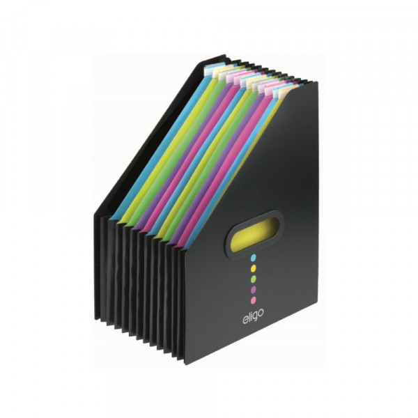 Elegantan uspravni proširivi organizator za radni sto i policu. Odličan način sortiranja i arhiviranja dokumenata – posebno tamo gde je prostor za čuvanje ograničen. 13 proširivih odeljaka za papire i dokumente. Isporučuje se sa plastikama za obeležavanje. Spoljašnost izrađena od čvrstog 1,8 mm Eligo crnog polipropilena.
